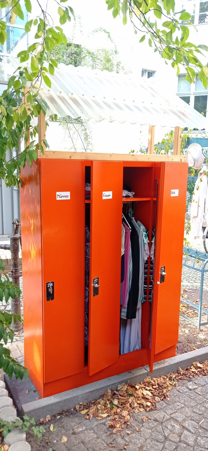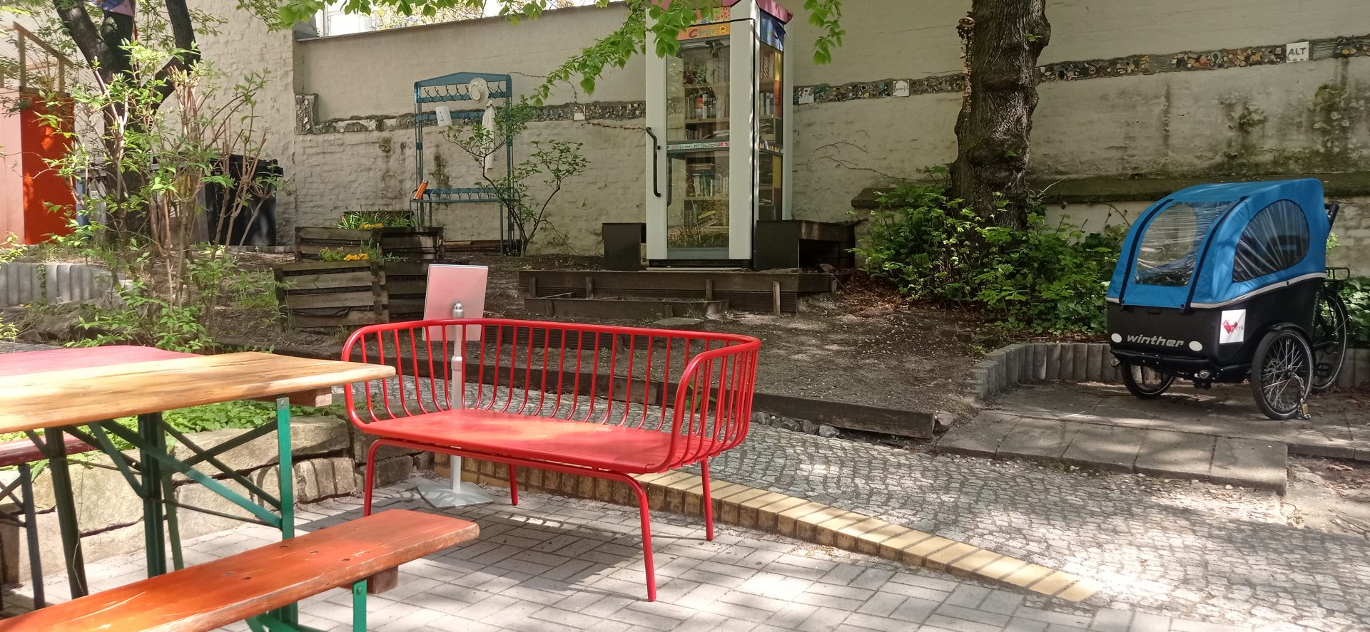 Wenn Sie beide Eingangstore unseres Hauses passieren, gelangen Sie in den Hofgarten. Hier finden Sie im oberen Bereich unsere Tauschschränke für Kleidung, Bücher und andere Dinge. Im unteren Teil des Hofes gibt es einen Sandkasten mit Spielzeug für Kinder und eine kleine Veranda mit Sitzgelegenheit.