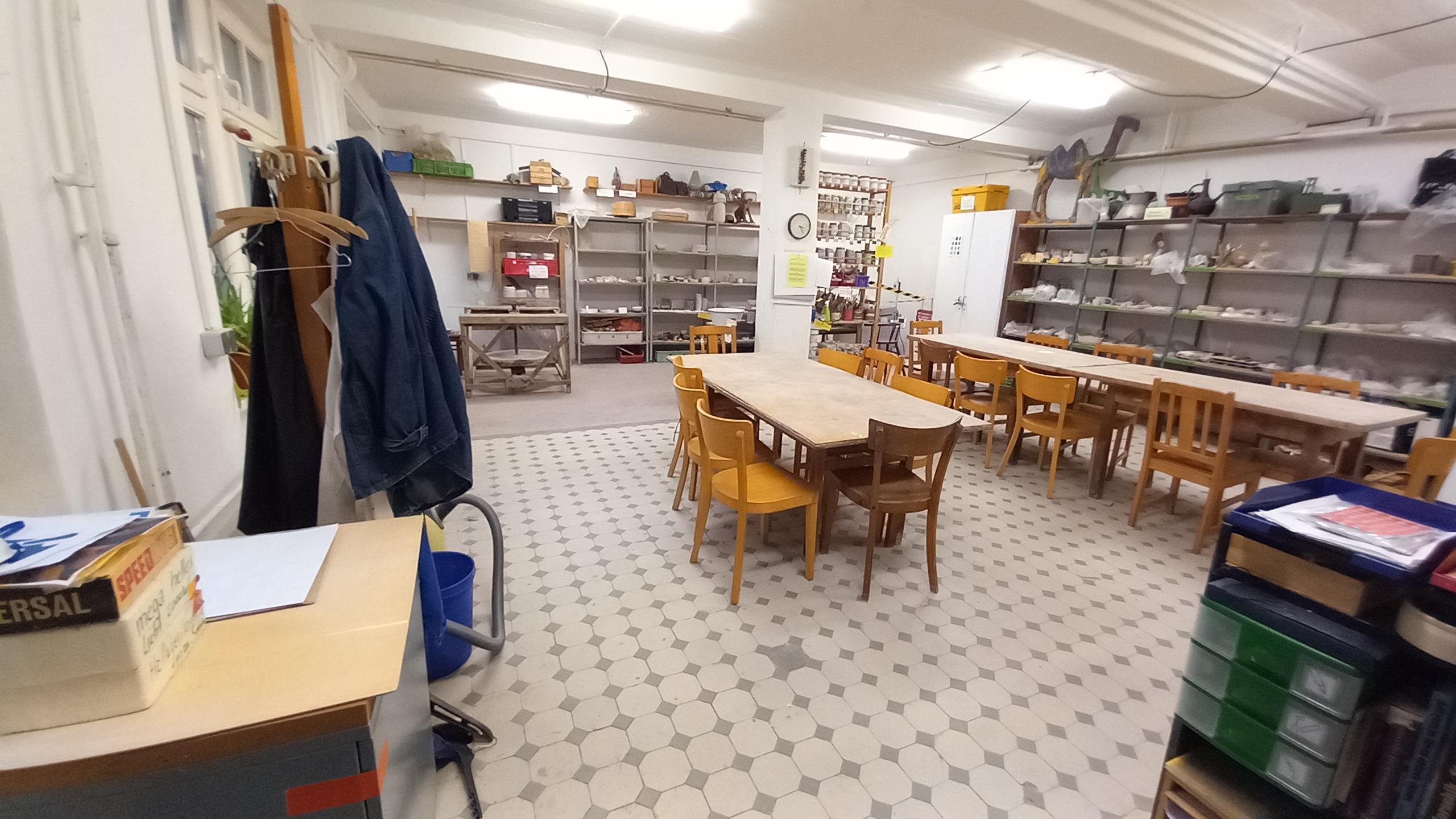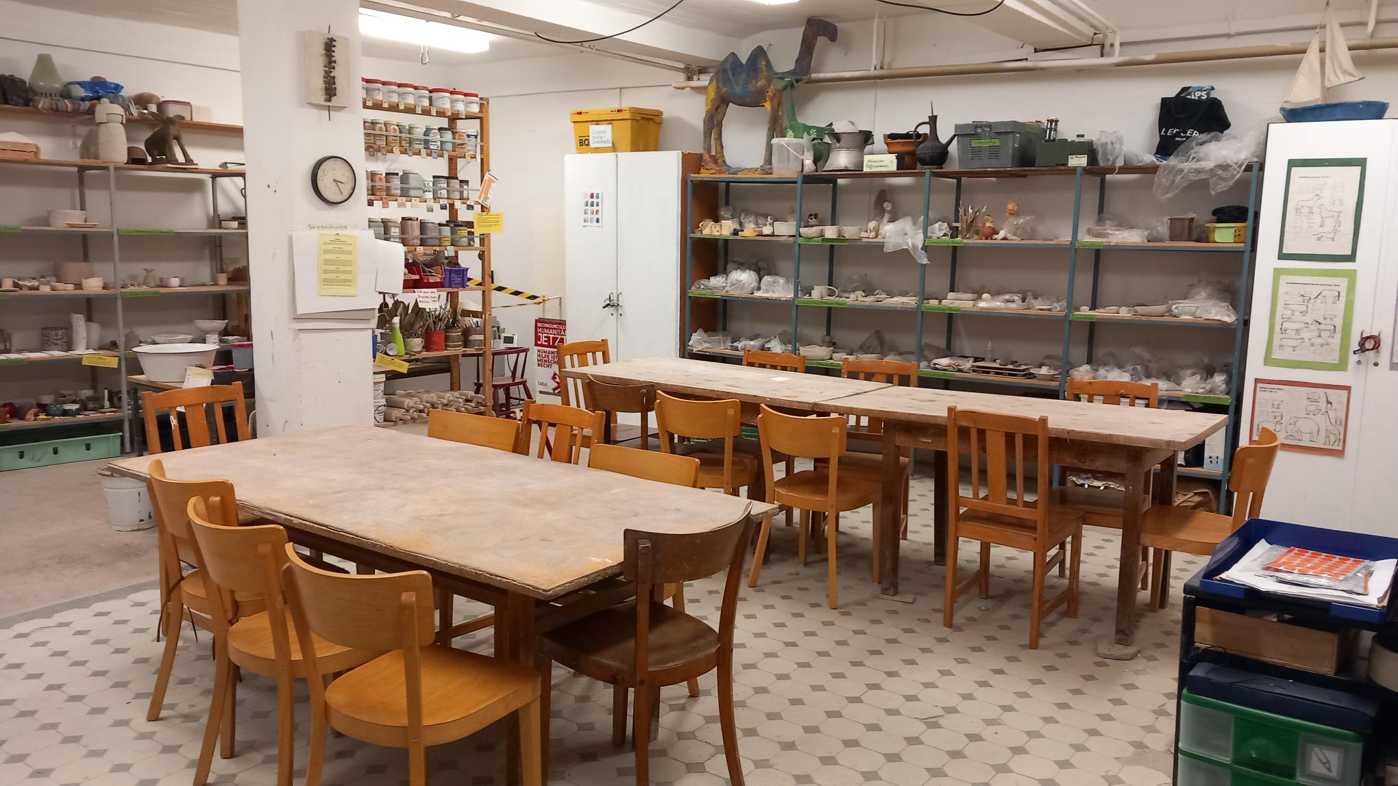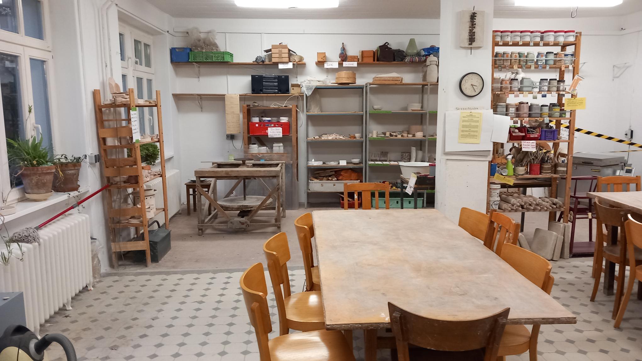 Ebenfalls über den Hofgarten zu erreichen und in direkter Nachbarschaft zur Öko- befindet sich die Keramikwerkstatt. Der weitläufige Raum ist mit mehreren Tischen und Stühlen, Trockenregalen für Keramik und einem Brennofen ausgestattet. Damit ist er neben Keramikangeboten auch zum Werkeln, Schrauben, und für andere Kreativangebote geeignet. Werkzeug-, Bastel- und Töpfermaterial können wir nach Absprache zur Verfügung stellen. Die angrenzende Küche und eine nicht-barrierearme Toilette (eine solche finden Sie im 1. OG) sind ebenfalls über die Keramikwerkstatt erreichbar.
