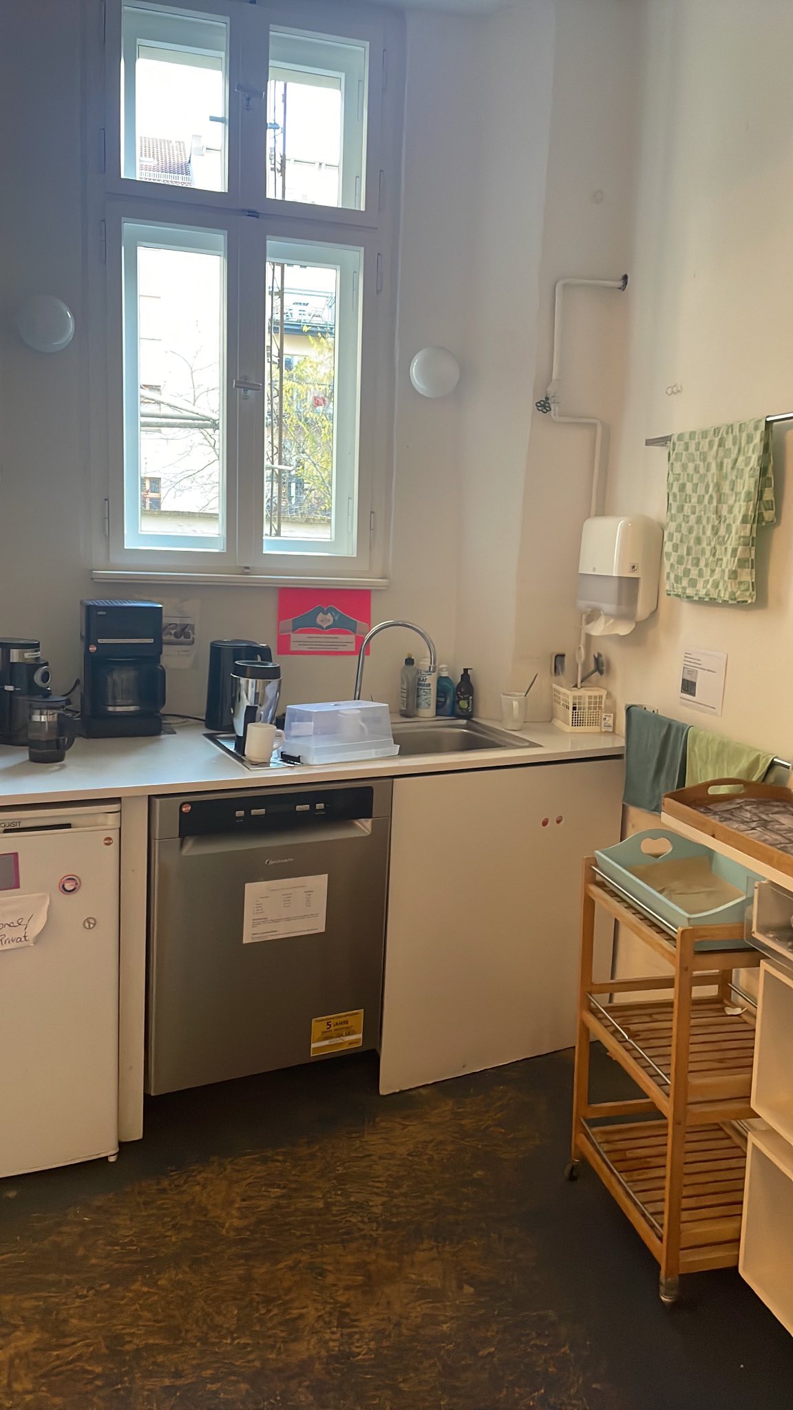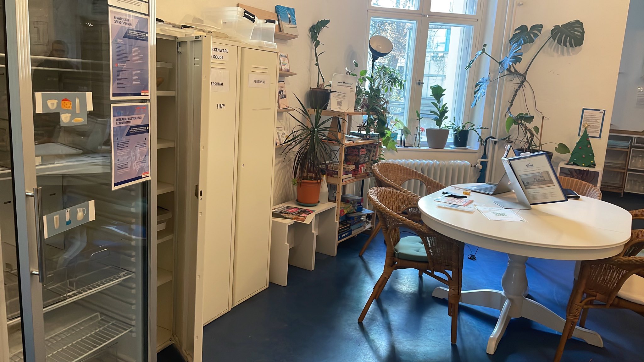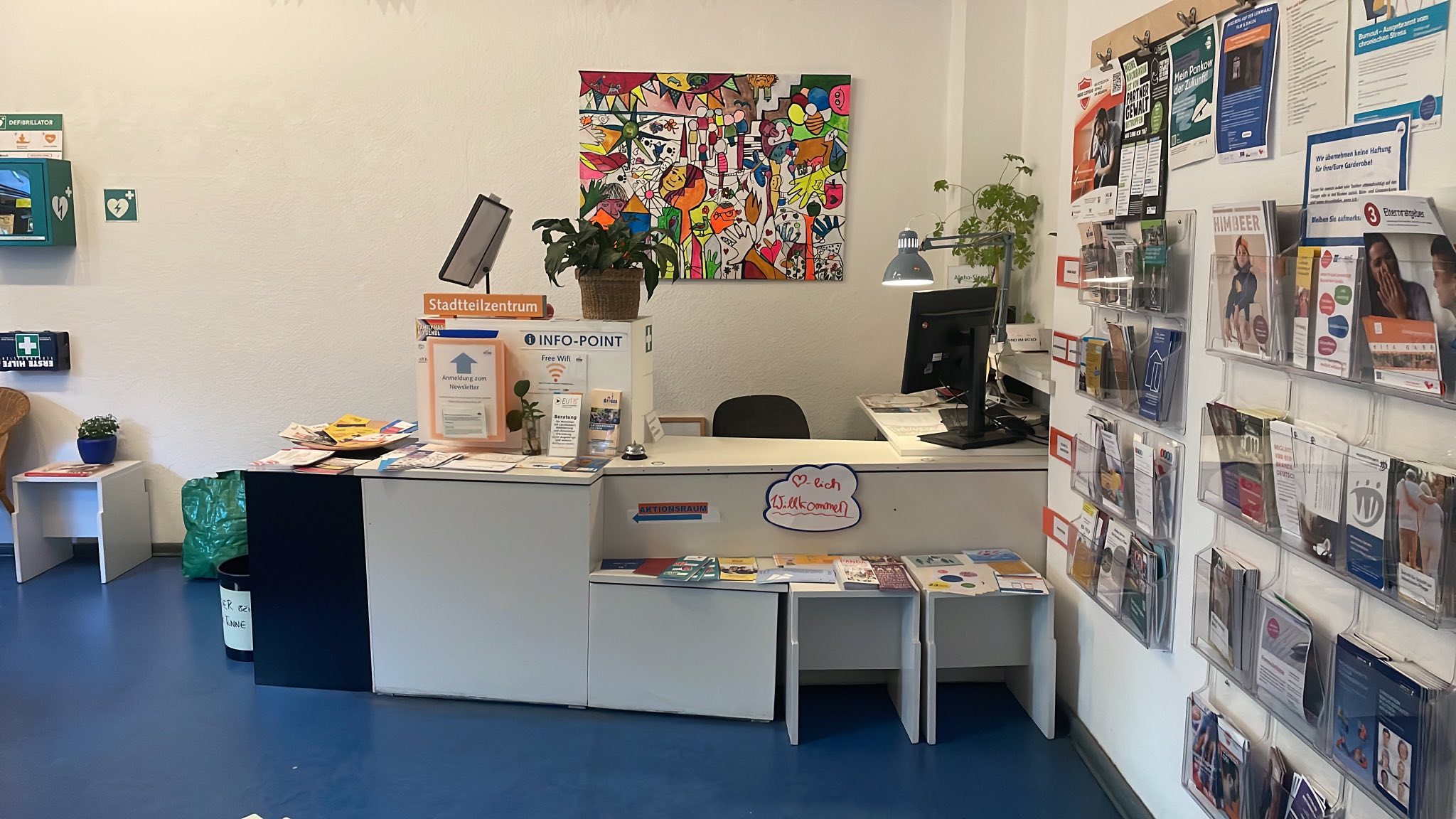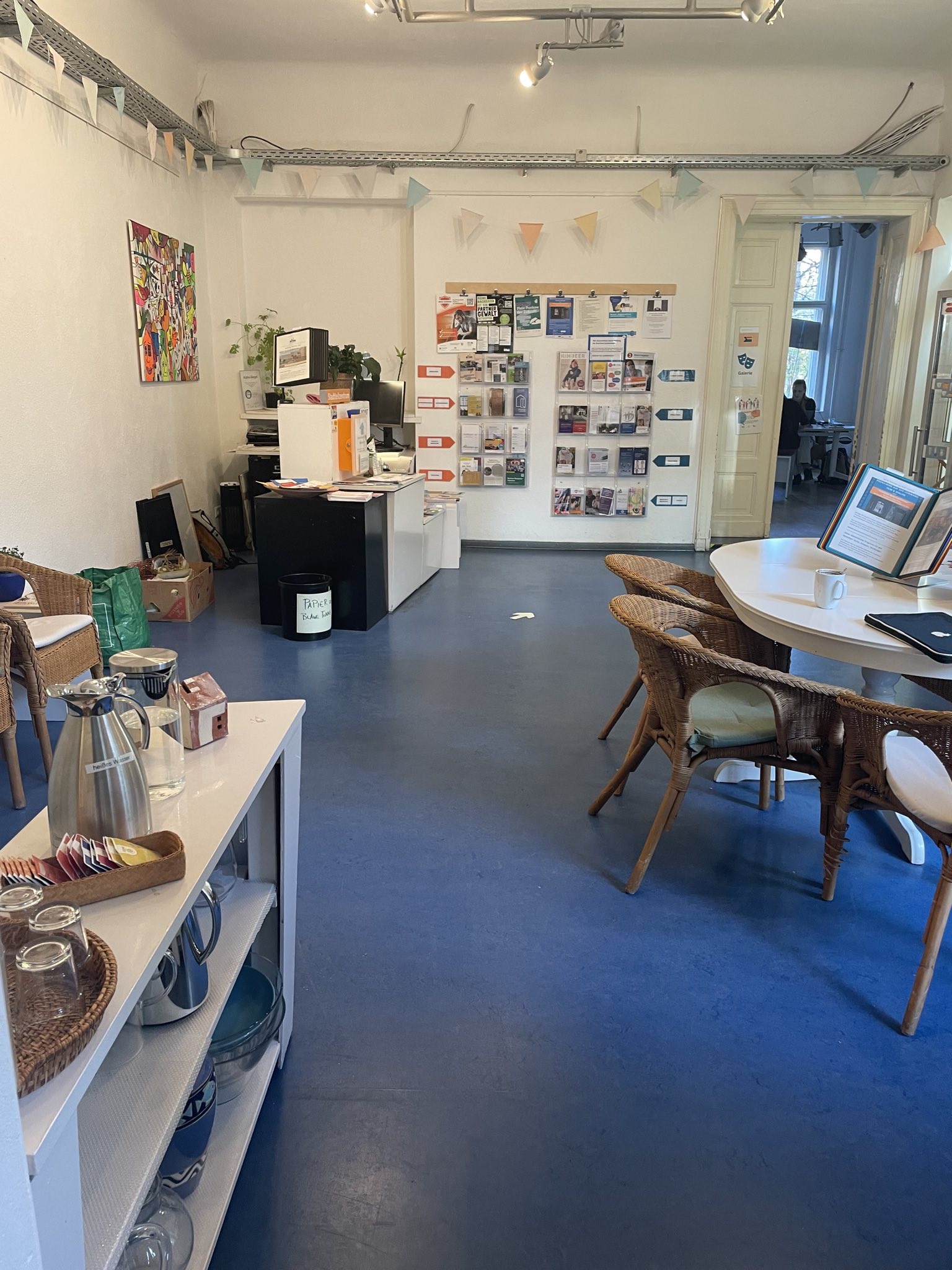 Das angrenzende Foyer mit Kaffeeküche bildet den Eingangsbereich. Hier finden Sie während unserer Öffnungszeiten eine*n Kolleg*in am Infopoint, unsere frei zugängliche Kaffeeküche und den Lebensmittelverteiler. Die Sitzgruppe ist ein Aufenthalts- und oft auch Wartebereich für die Beratungsangebote vor Ort.
